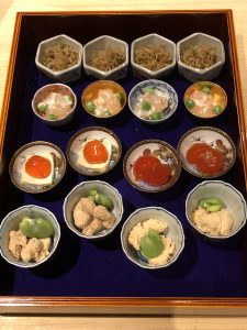 白魚 うるいとホタルイカ 初生卵味噌漬け チリメン山椒 鯛の子と一寸豆 ボタンエビ塩麹 鯛の昆布締めと花山葵 菜種と蛸の柔煮